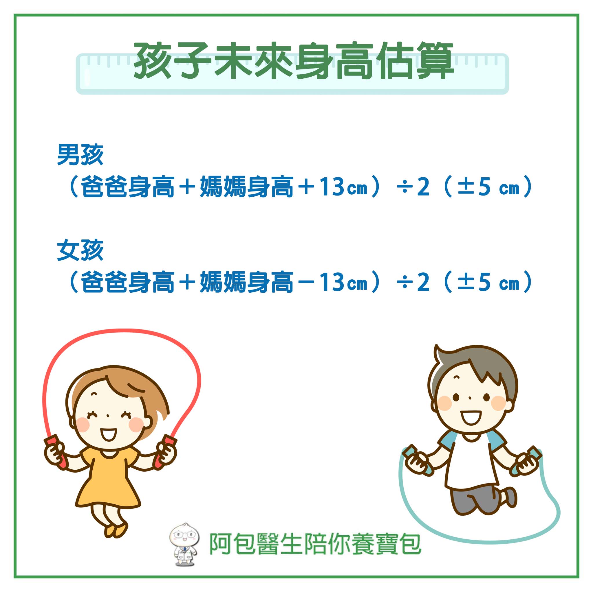 女孩:(爸爸身高+媽媽身高-13㎝)÷2(±5 ㎝)